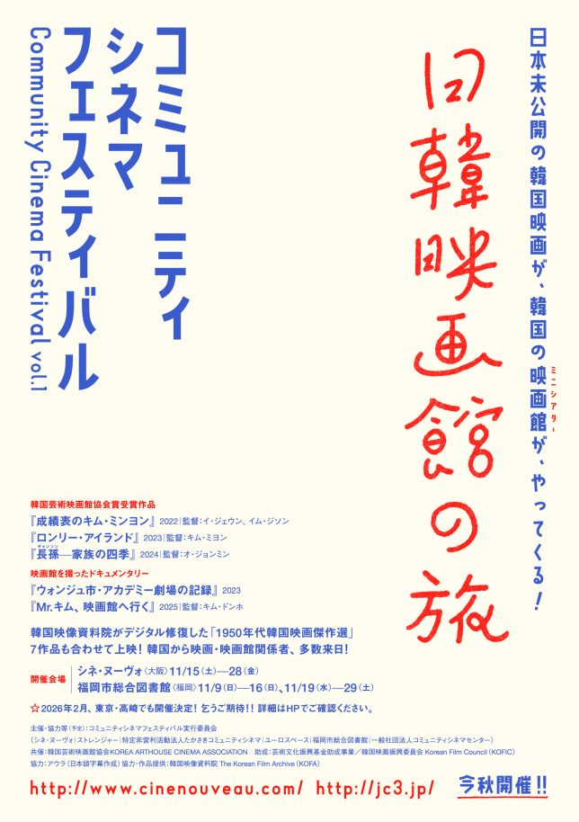 일본 커뮤니티 시네마 센터는 올 가을부터 일본 각지의 커뮤니티 시네마가 협업해 기획한 새로운 프로그램 「커뮤니티 시네마 페스티벌」을 개최한다. 「커뮤니티 시네마 페스티벌」은 '공공적인 상영의 장소' 커뮤니티 시네마로서의 미니 시어터나 시네마 테크의 매력이나 중요성을 널리 전하기 위하여 마련된 전국 각지의 커뮤니티 시네마가 공동으로 개최하는 '영화제'라고 할 수 있다. |