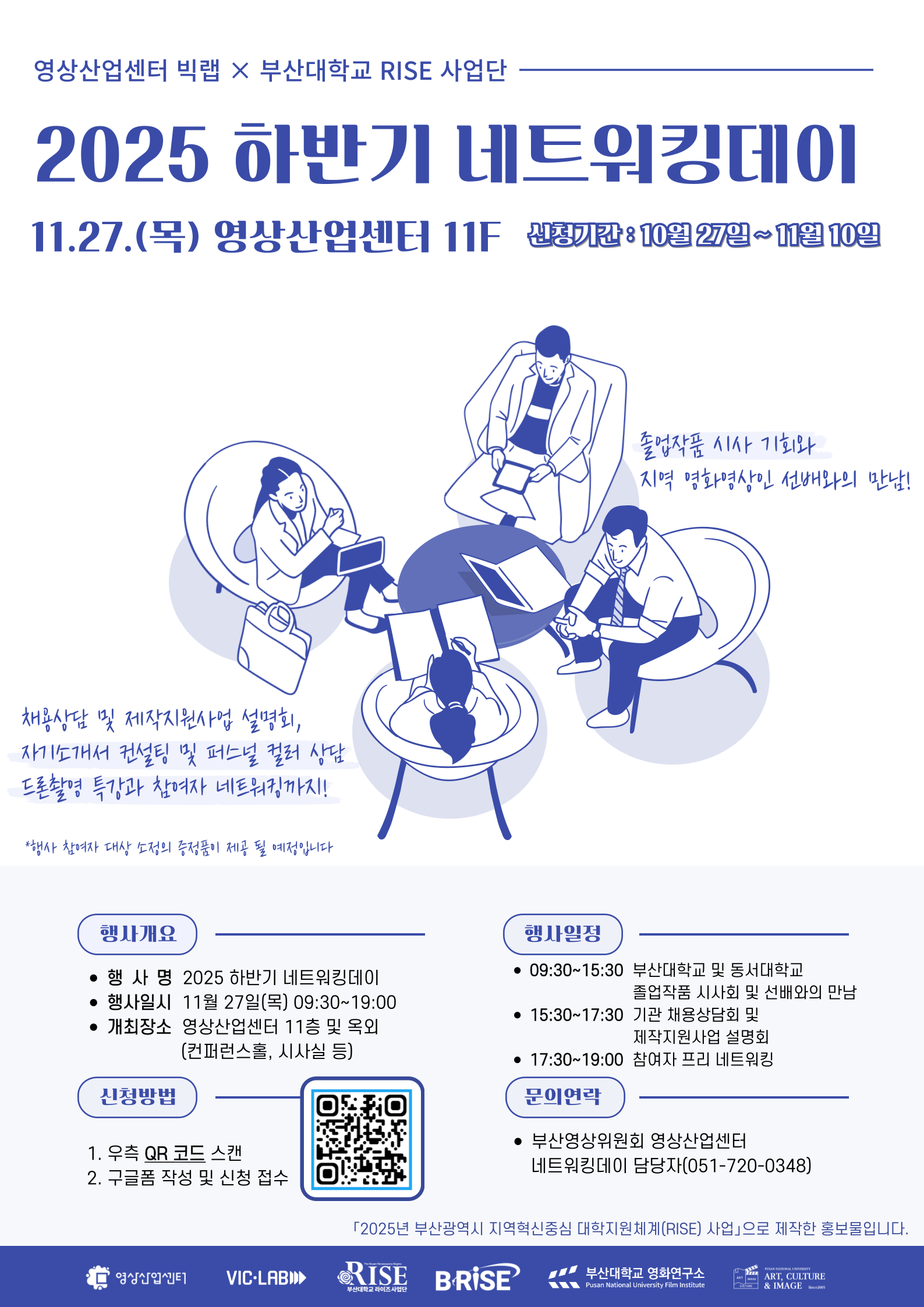 2025년 11월 27일(목), 영상산업센터에서 '2025 영상산업센터-빅랩 X 부산대학교 RISE 사업단 하반기 네트워킹데이'가 열린다. 이번 행사는 부산영상위원회, 영상산업센터(빅랩), 부산대학교 RISE 사업단, 부산라이즈혁신원, 부산대학교 영화연구소, 부산대학교 예술문화영상학과가 주최·주관한다.
